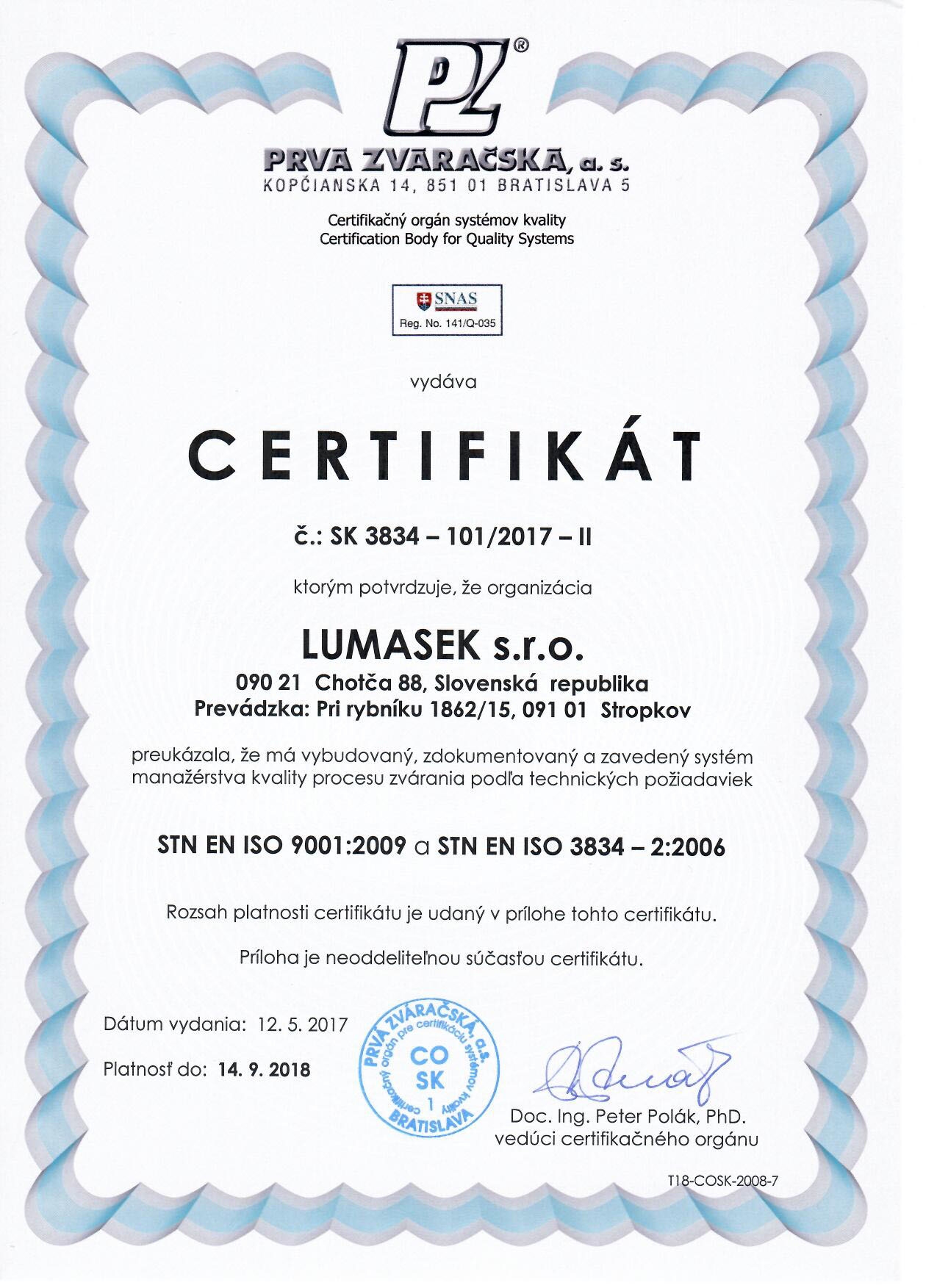 Lumasek, s.r.o. STN EN ISO 9001:2009 a STN EN ISO 3834 - 2:2006 Certifikáty