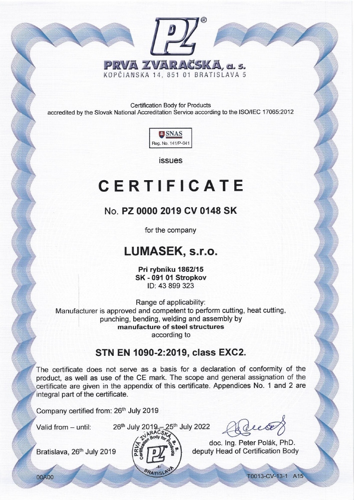 Lumasek, s.r.o. CE EN 1090 Certifikáty